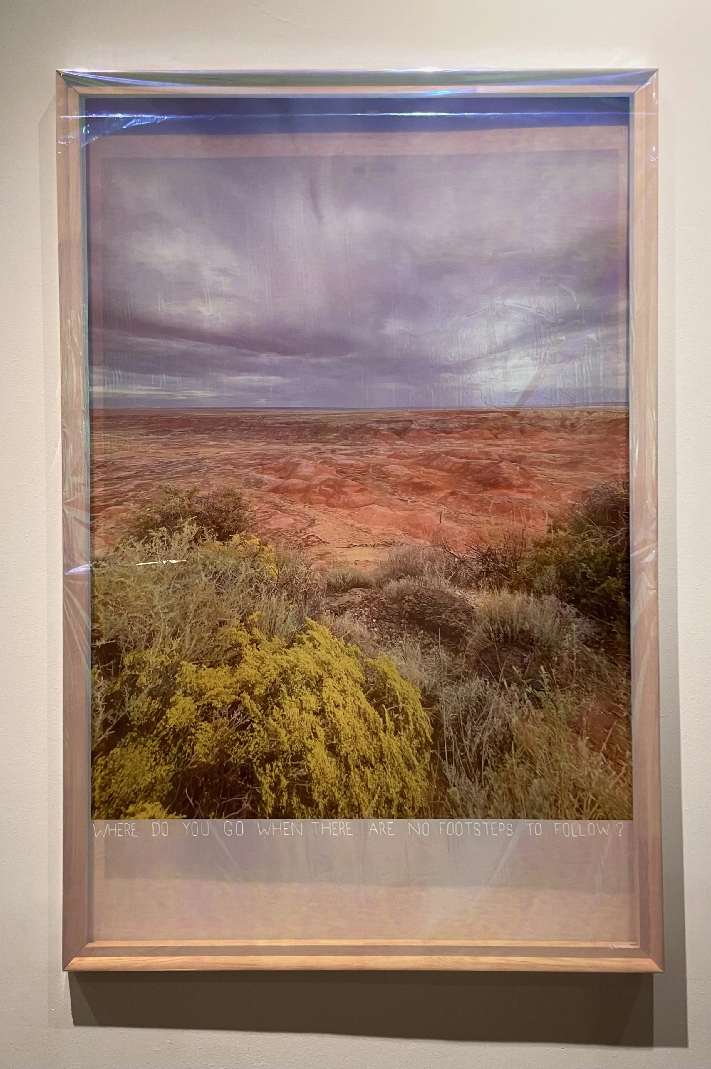 This collection of photographs, printed on clear Mylar, offers a meditative exploration of the Painted Desert, a landscape shaped over millennia by wind, water, and time. The translucent medium invites viewers to see these vistas as both present and impermanent—an echo of their fragile state in a changing world. The desert’s stark beauty, with its striated mesas and shifting hues, becomes a canvas for contemplation on the forces that continue to shape it, from the slow erosion of natural elements to the accelerated impacts of climate change, human activity, and wildlife migration.